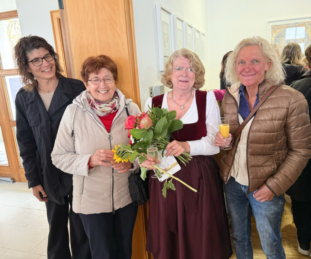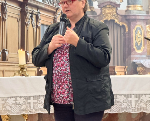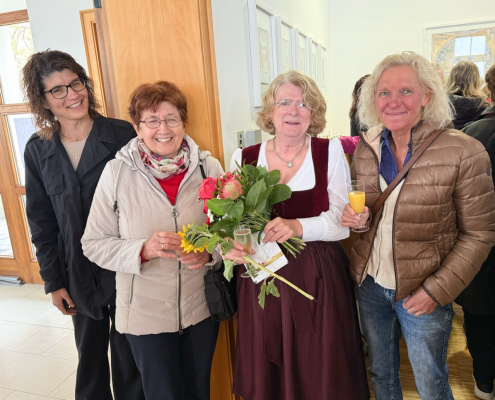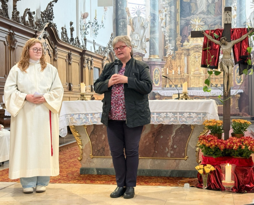 Einen blumigen Gruß aus Vilzing überreichte Christoph Zistler als Kirchenpfleger der Expositur und dankte für die Arbeit und die Aushilfen in St. Laurentius. Die lange Schlange der Gratulanten setzte sich fort mit Michaela Schedlbauer und Christine Maurer für das Familiengottesdienstteam, welche eine bebilderte Uhr als kleines Geschenk überreichten. Vertreterinnen der Gemeindereferentenarbeit und des Hospitzdienstes dankten ebenfalls in berührenden Worten Beate Schmaderer für ihre langjährigen Dienste. Zum Schluss des Gottesdienstes ergriff Beate Schmaderer selbst nochmal das Wort und erzählte über ihre Laufbahn und die verschiedenen Stationen ihres beruflichen Lebens.
