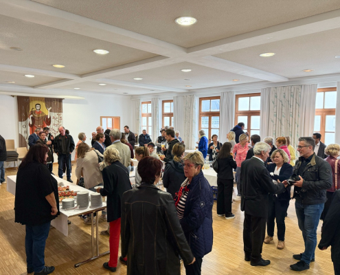 Nach dem Festgottesdienst gab es im Pfarrheim bei vielen vorbereiteten Leckereien noch ausreichend Gelegenheit untereinander ins Gespräch zu kommen. Das gut gefüllte Pfarrheim zeigte, dass viele der Einladung gerne gefolgt sind. Vergelts Gott den Helferinnen aus der Kirchenverwaltung Cham St. Jakob für die Organisation und die Vorbereitung des Stehempfangs.