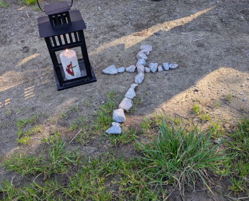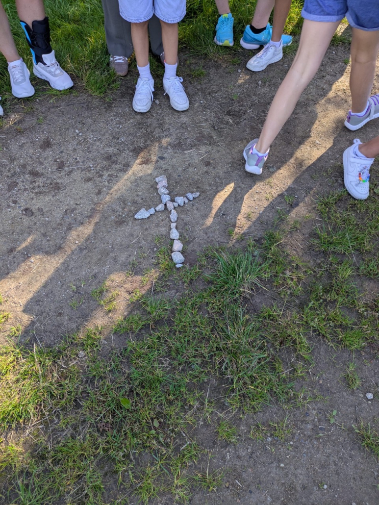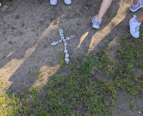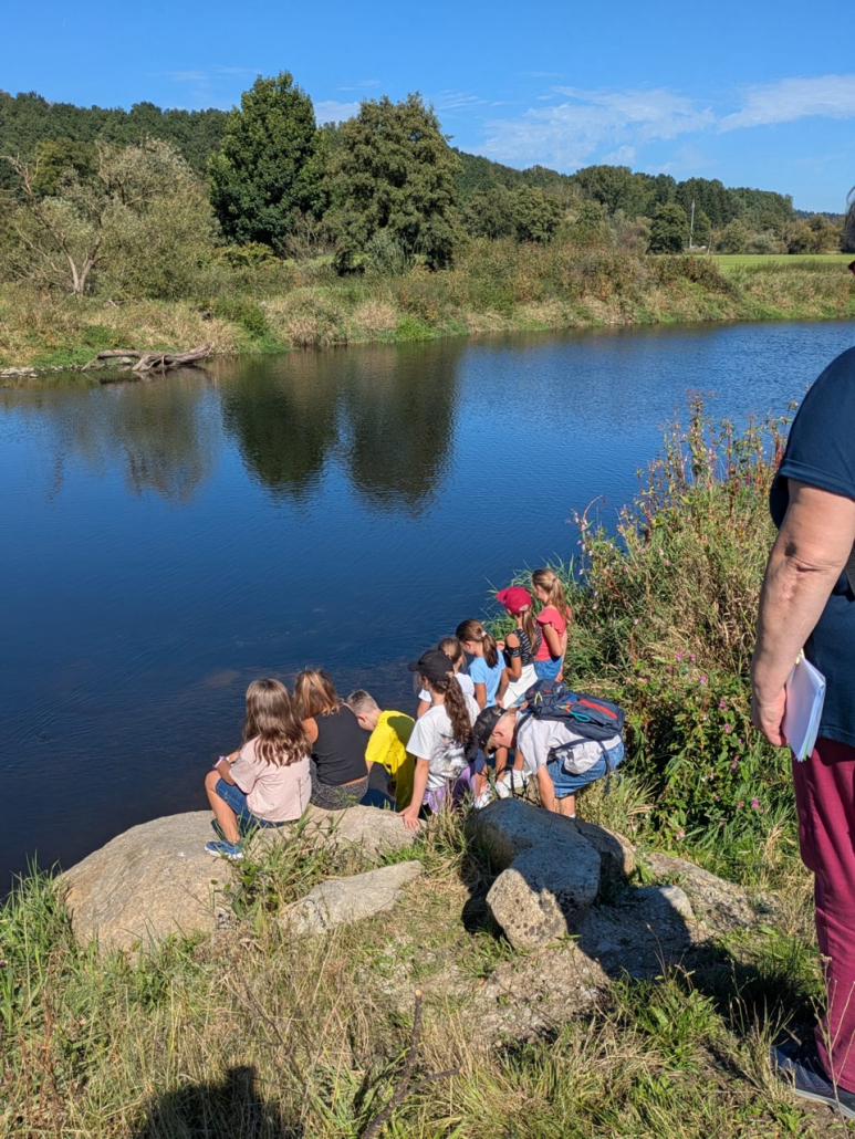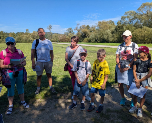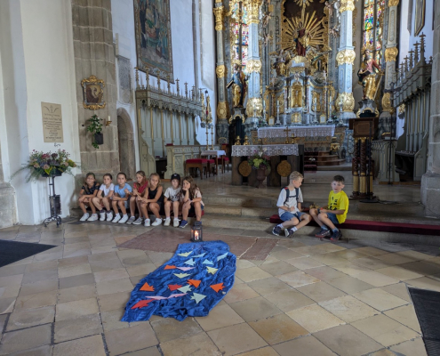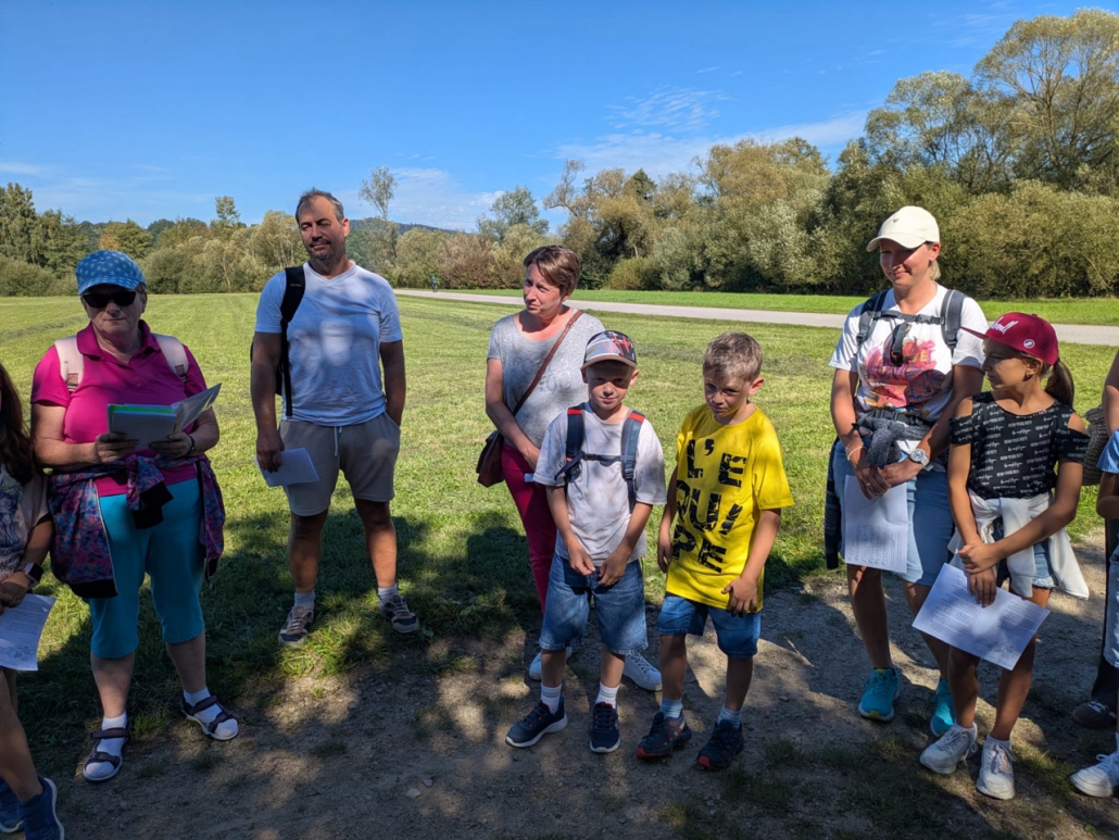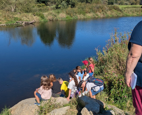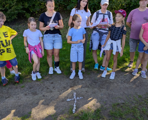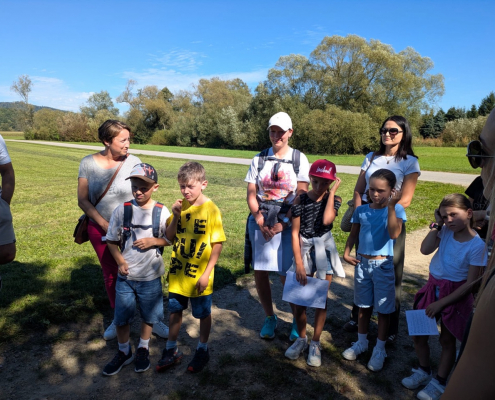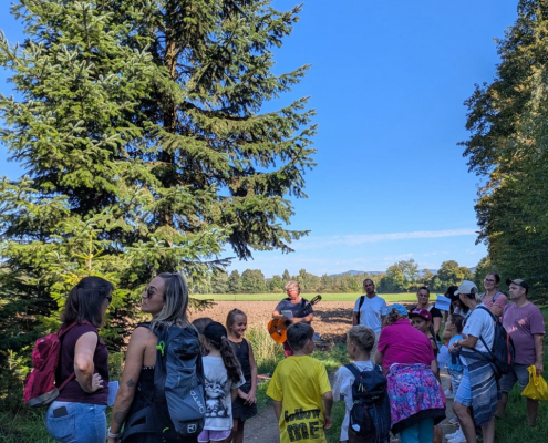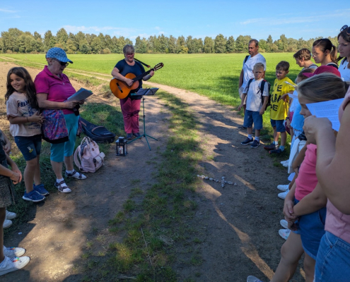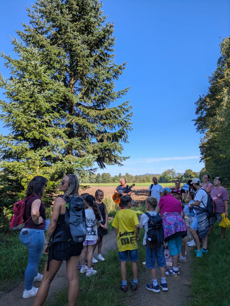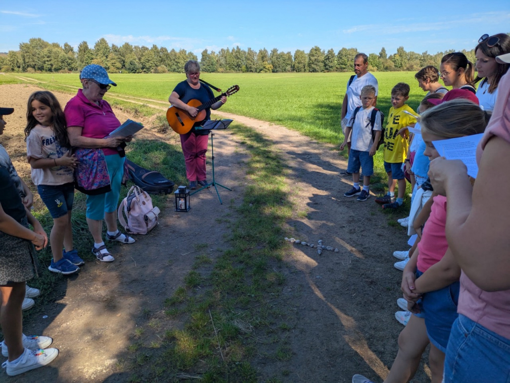 Es galt Gott zu danken, dass er uns seine Welt anvertraut hat. Die Luft mit allen Sinnen zu erfahren, die Stille am Wasser genießen und darüber nachzudenken, was Steine mit unserem Leben zu tun haben, wurden thematisiert. Die Kinder durften erfahren, dass auch Bäume uns Vorbild für unser Leben sein können und uns stark machen. Die gemeinsame Andacht in der Kirche mit einer Geschichte von den Fischen im Wasser gab den Kindern den Impuls, dass auch wir umgeben sind von Gott, wie die Fische im Wasser schwimmen. Alle Kinder und Erwachsene haben sich interessiert beteiligt beim Lesen von Psalmen und beim gemeinsamen Singen.