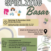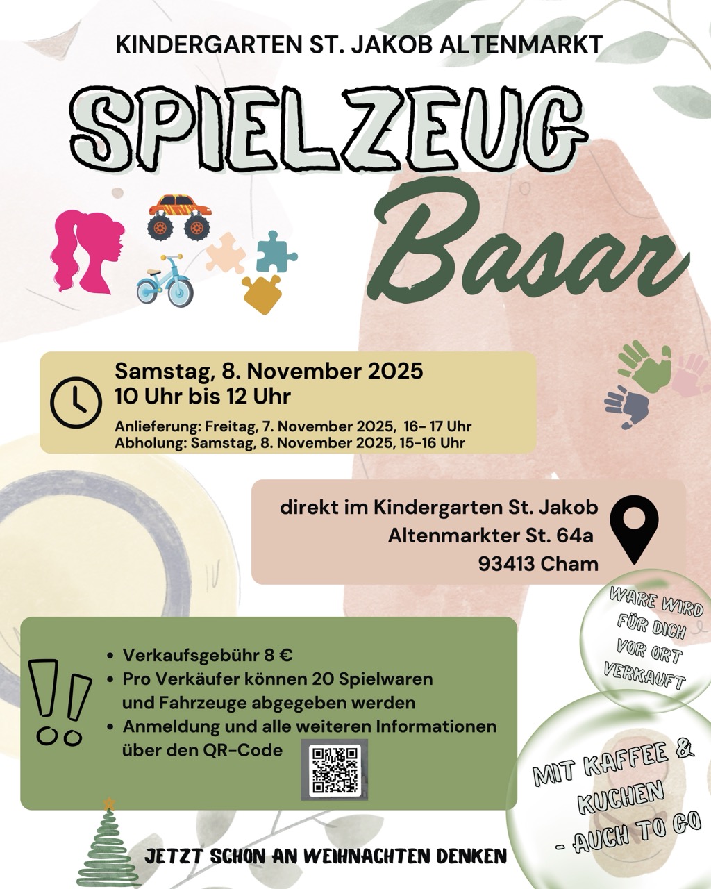 Das Team des Kindergartens St. Jakob Altenmarkt und der Elternbeirat haben es sich deshalb auf die Fahne geschrieben, einen Spielwarenbasar im Chamer Stadtgebiet zu veranstalten. Der Elternbeirat hat sich dabei überlegt, dass die Ausrichtung speziell auf Spielwaren und Kinderfahrzeuge vor allem vor Weihnachten eine tolle Gelegenheit ist um günstig noch gut Erhaltenes für seine Liebsten zu erwerben.