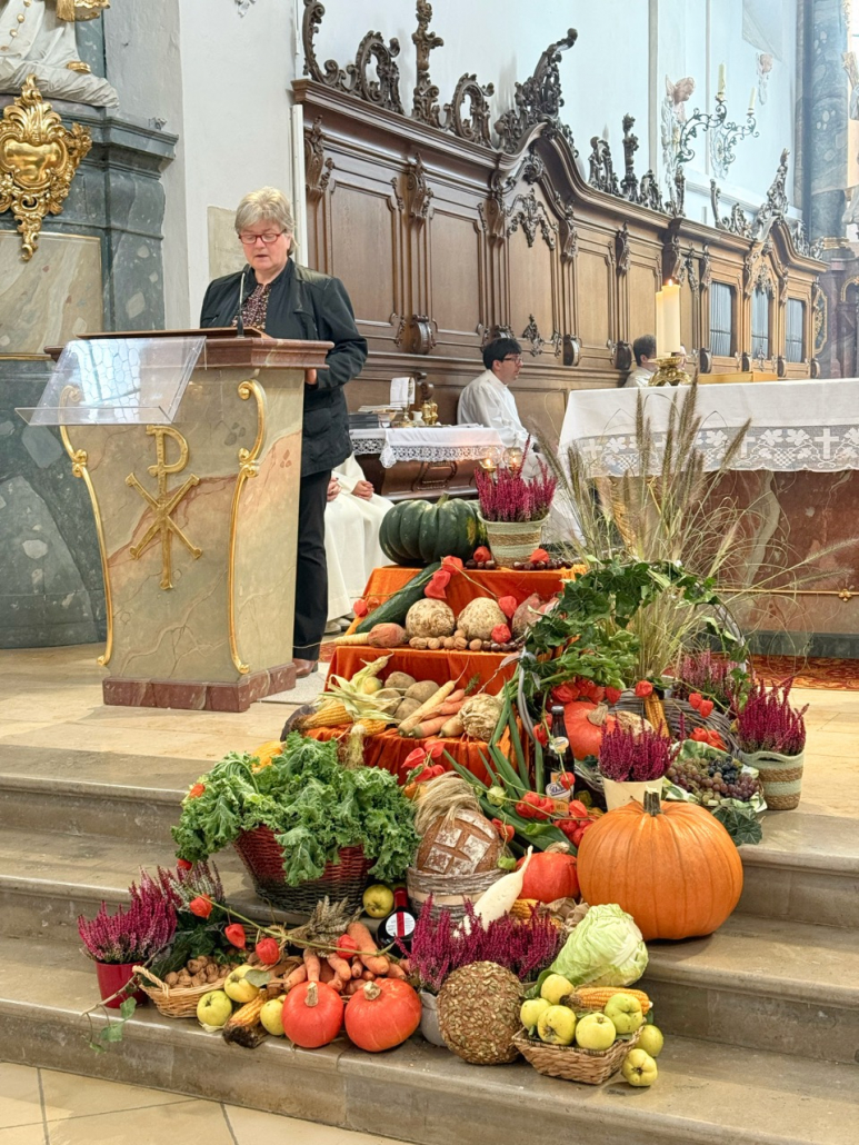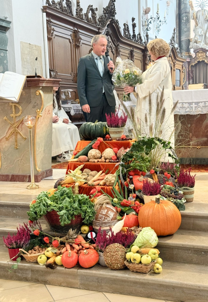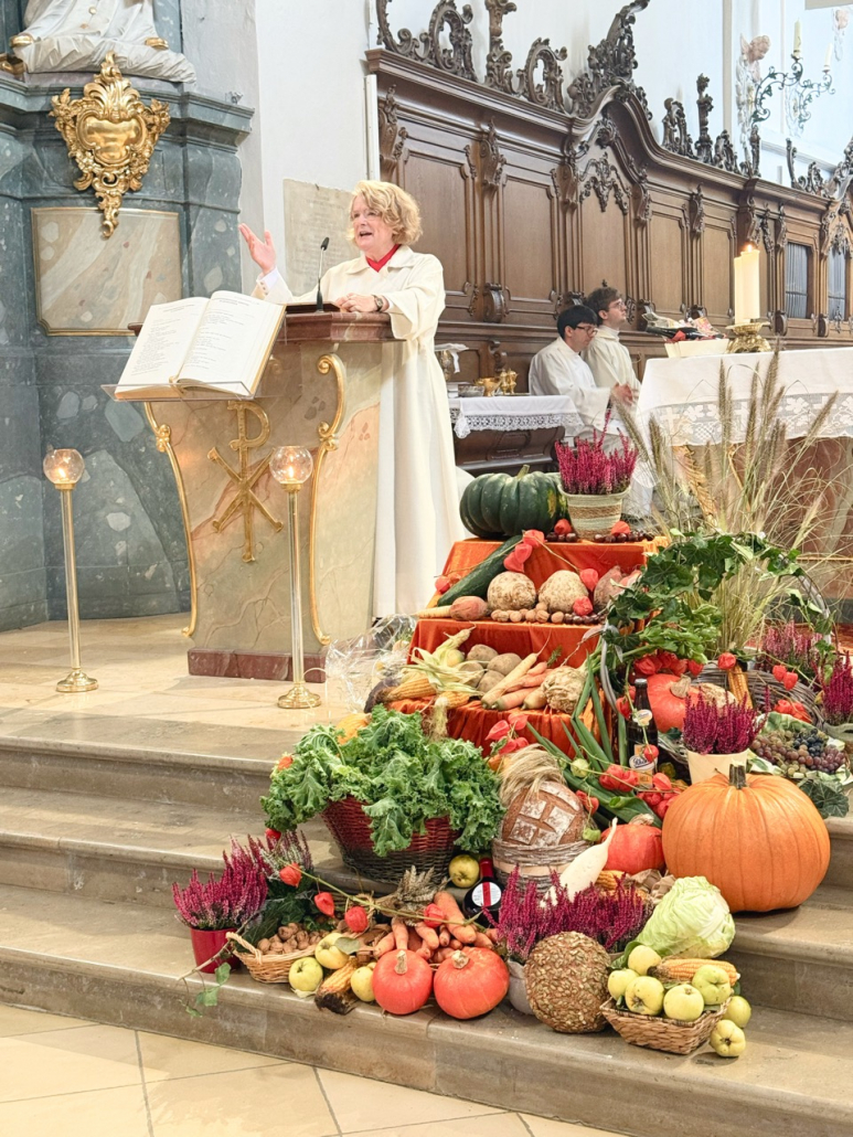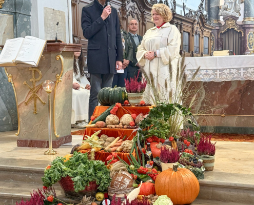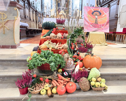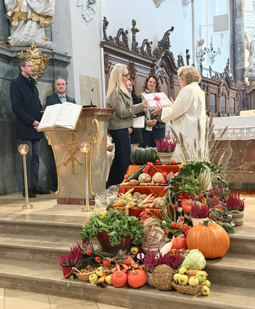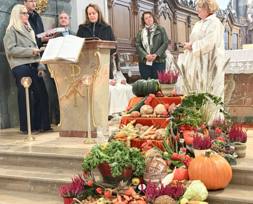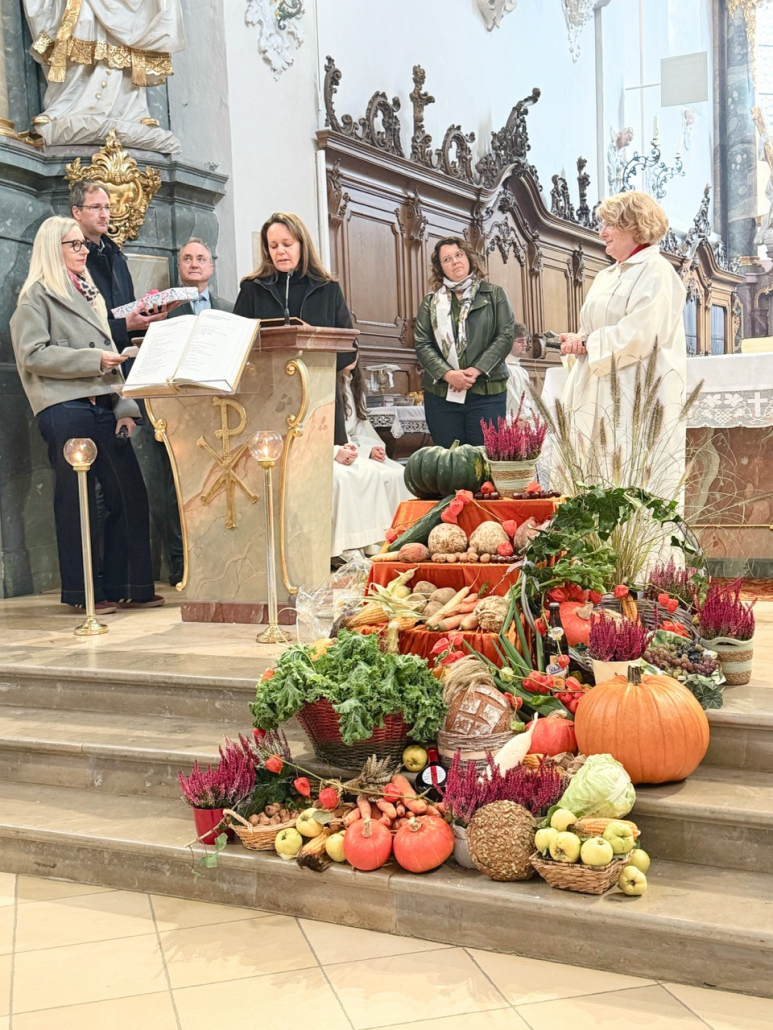 Heute durften wir Erntedank in doppelter Bedeutung feiern. Der mit vielen Früchten, Gemüse und Speisen üppig gestaltete und geschmückte Erntedankaltar lud bereits zur Mitfeier dieses besonderen Gottesdienstes ein. „Erntedank“ feierte heute aber auch unsere Gemeindereferentin Beate Schmaderer, die heute aus dem aktiven Berufsleben ausgeschieden und nach 45 Jahren in den wohlverdienten Ruhestand gewechselt ist.