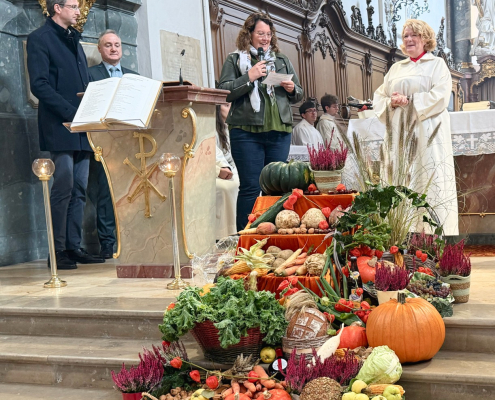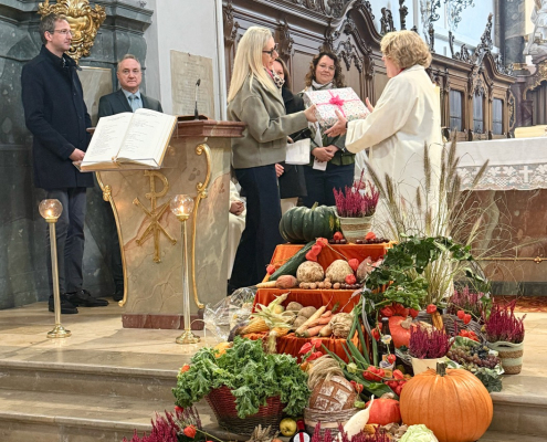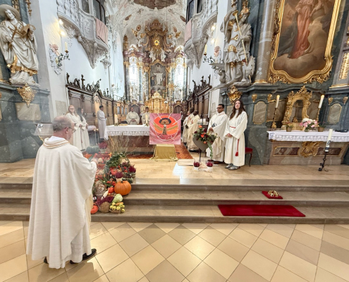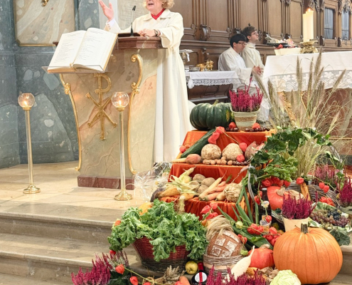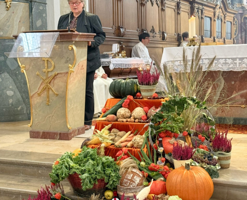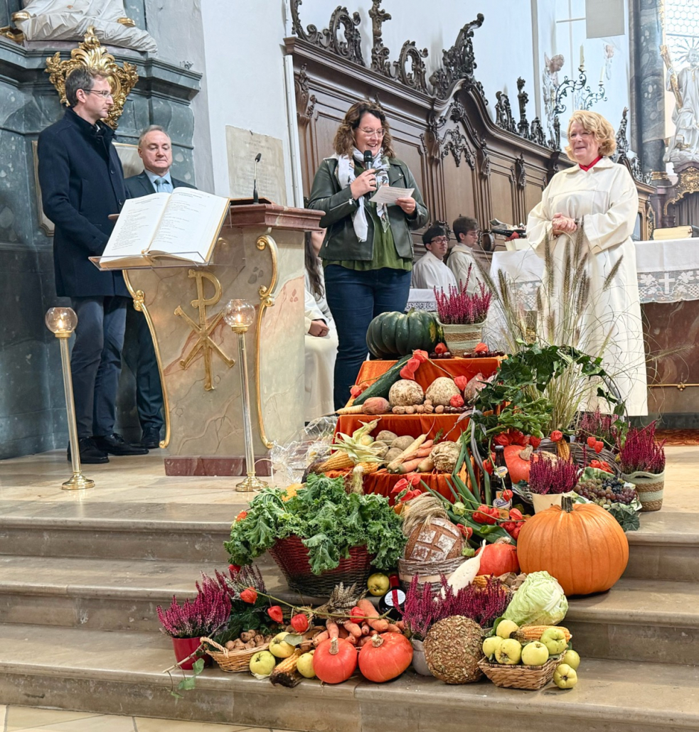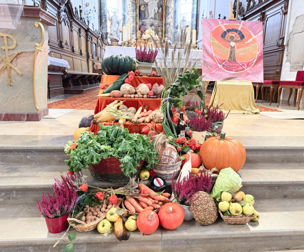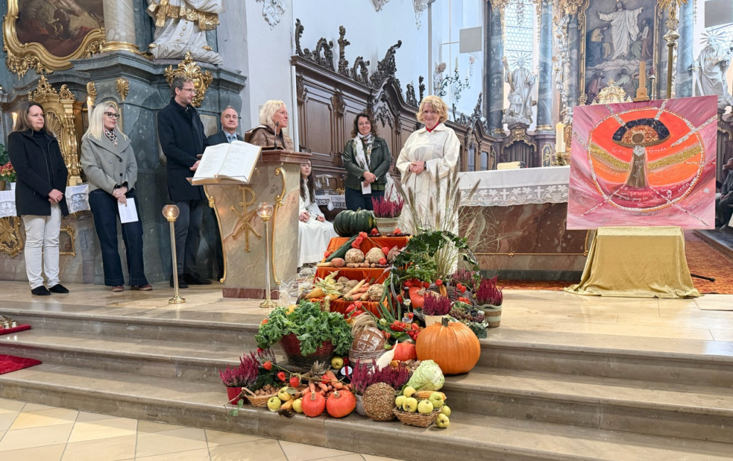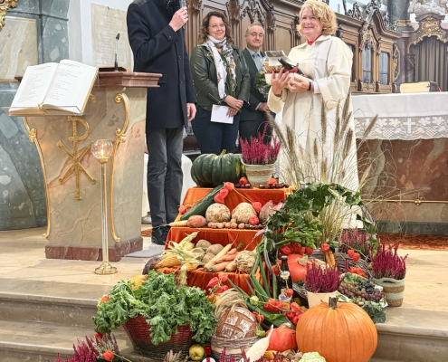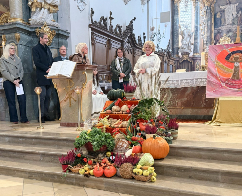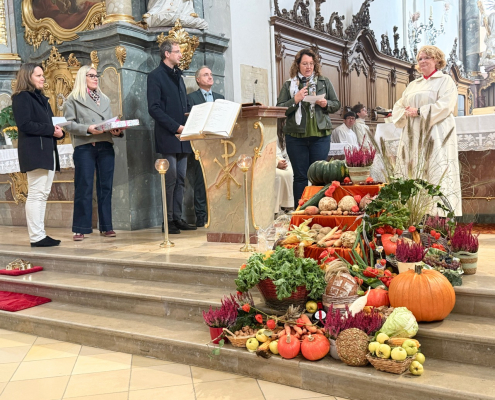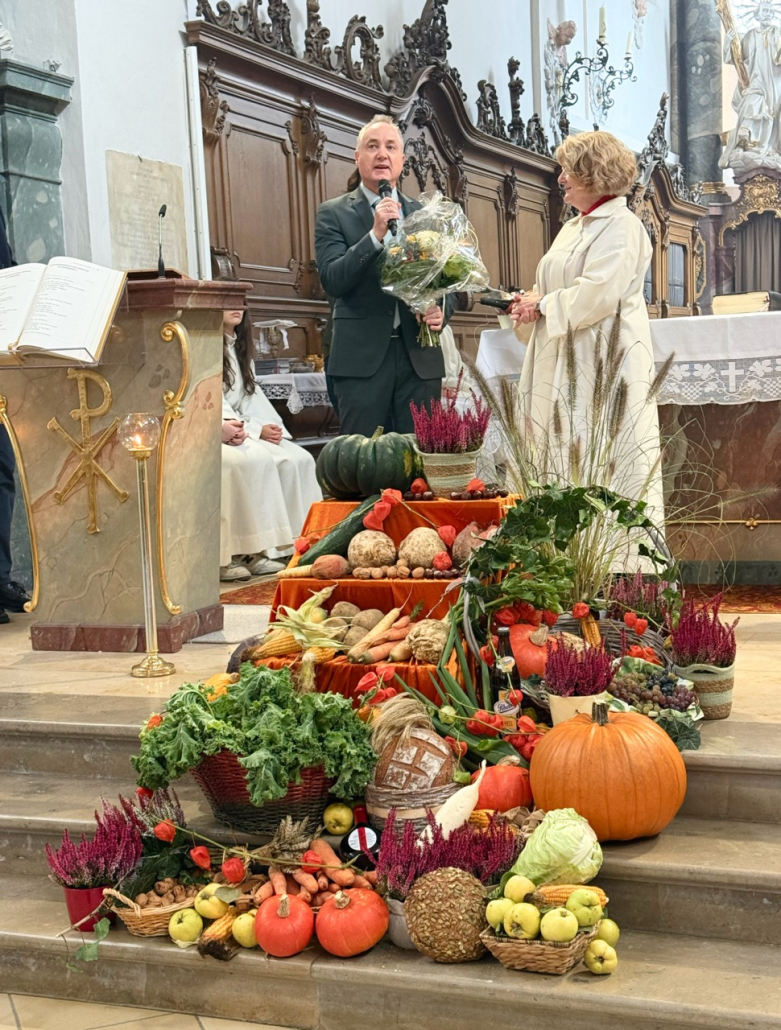 Heute durften wir Erntedank in doppelter Bedeutung feiern. Der mit vielen Früchten, Gemüse und Speisen üppig gestaltete und geschmückte Erntedankaltar lud bereits zur Mitfeier dieses besonderen Gottesdienstes ein. „Erntedank“ feierte heute aber auch unsere Gemeindereferentin Beate Schmaderer, die heute aus dem aktiven Berufsleben ausgeschieden und nach 45 Jahren in den wohlverdienten Ruhestand gewechselt ist.