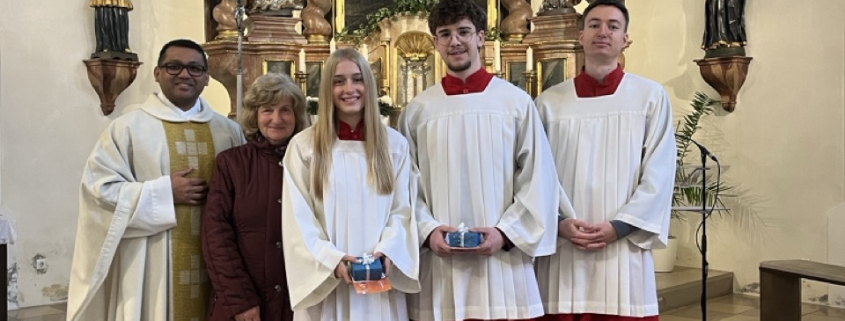 Weiter sprach er seinen Dank und seine guten Wünsche aus: „Für euren langjährigen Dienst am Altar wünschen wir euch Gottes Segen für die Zukunft. Möge euch diese Zeit in guter Erinnerung bleiben und ihr mit Freude darauf zurückblicken.“
