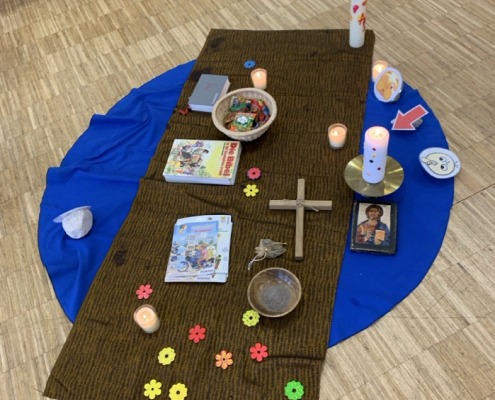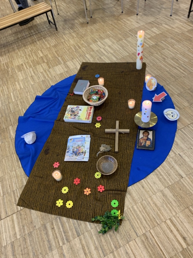Nach der Begrüßung und einem Lied durften die Kinder einen Fastenweg gestalten. Dabei konnten sie verschiedene Sachen passend zur Fastenzeit am Boden legen. Das waren eine Schale mit Asche, ein Kreuz, viele Süßigkeiten, eine Bibel und Gotteslob, Blumen und Geld. Dabei wurde thematisiert, dass Fasten auch positiv sein kann. Dass es entlastet und frei machen kann. Aber es wurde auch thematisiert, wie „Steine“ unseren Weg zu Jesus und den Mitmenschen schwer machen kann.
