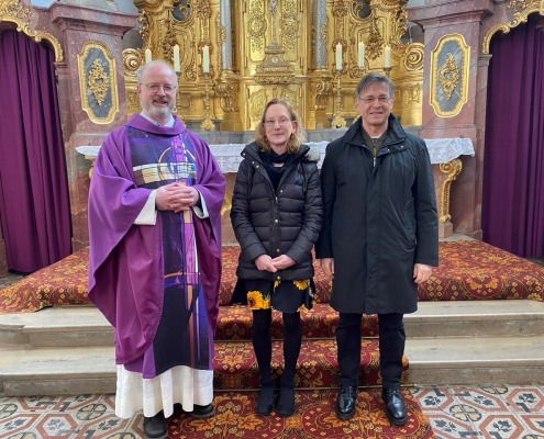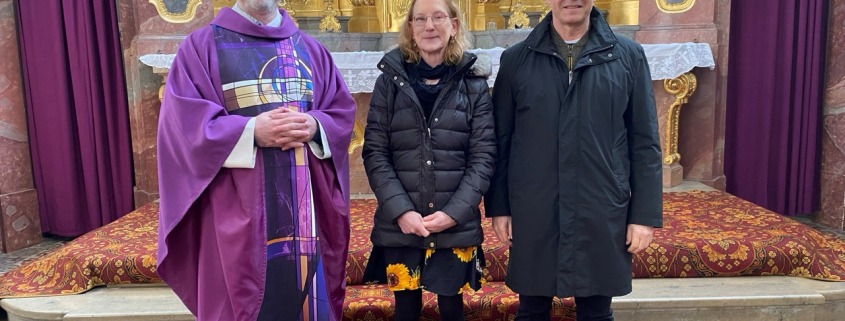 Im Bild: Pfr. Pater Bartsch mit Petra Schoplocher und Hans Staudner