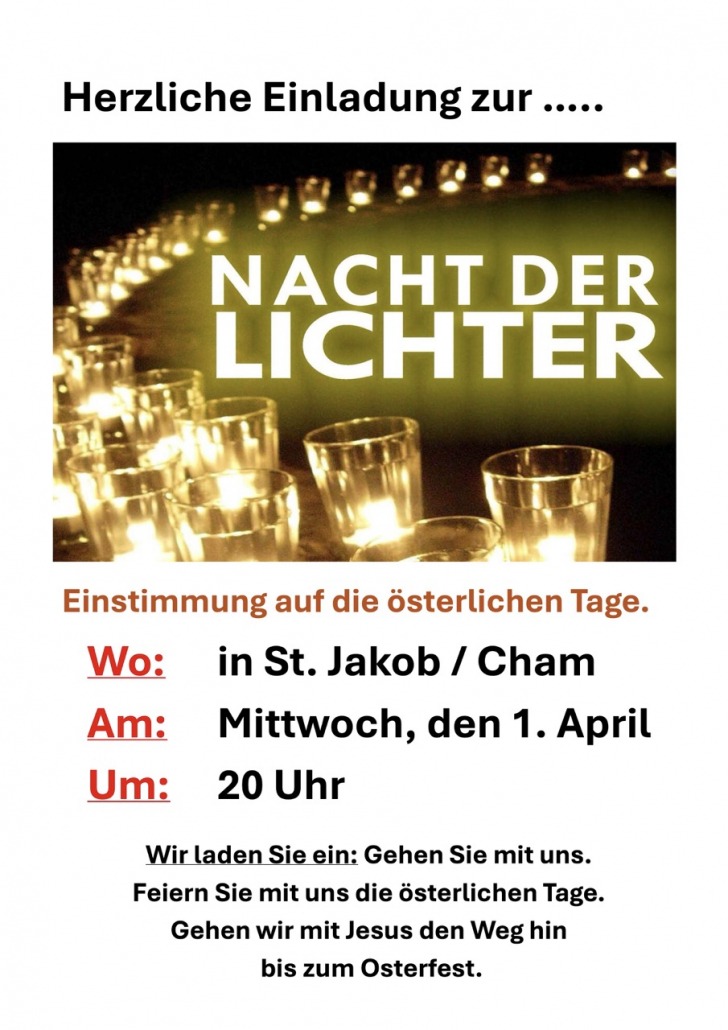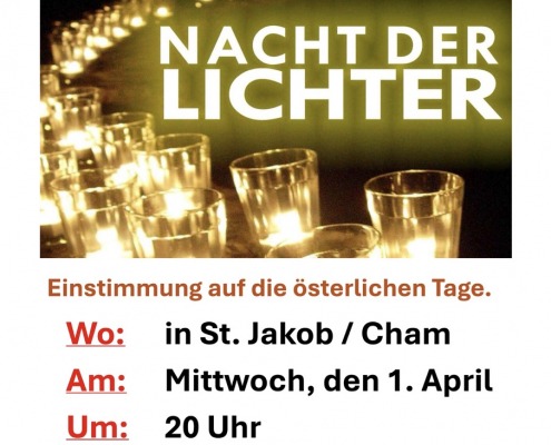 Du bist hier: Startseite1 / Beiträge2 / Beiträge Cham St. Jakob3 / Einladung zur Nacht der Lichter als Einstimmung auf die österlichen Ta...