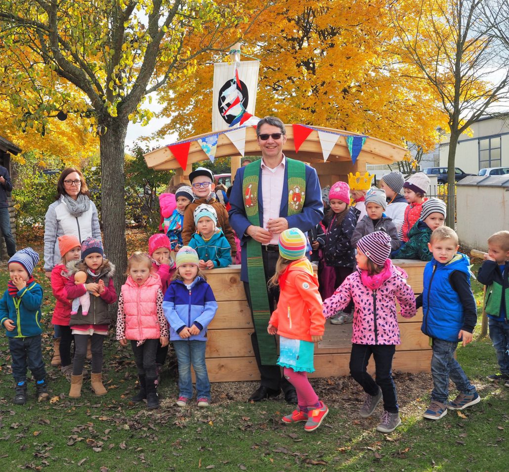 Am Ende der Andacht segnete Pfarrer Dieter Zinecker das neue „Piratenboot“ im Garten: Das große Holzspielgerät hatte der Elternbeirat organisiert und in Eigenleistung aufgebaut. Er wünschte den jungen Seeleuten allzeit ruhige See, nicht zu stürmische Winde und vor allem eine gute Mannschaft, mit der man auch den einen oder anderen Orkan meistern kann.