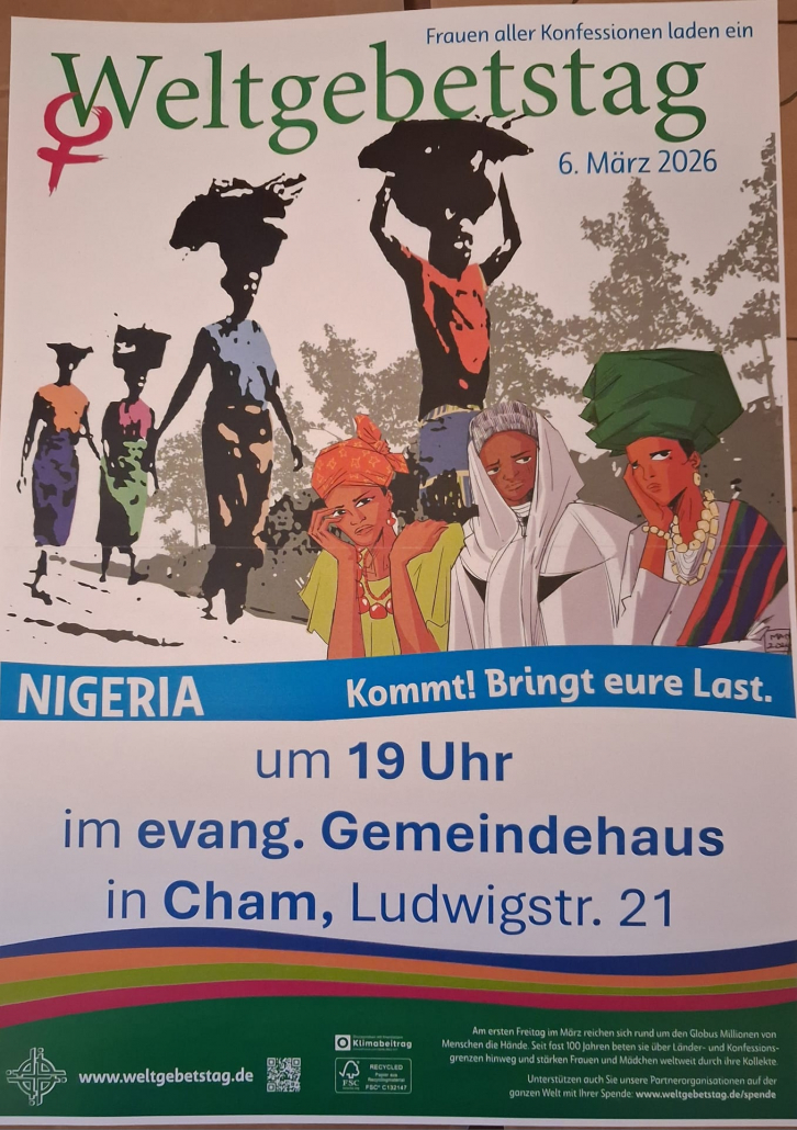Der Gottesdienst für den Weltgebetstag 2026 mit dem Titel „Kommt! Bringt eure Last.“ kommt aus Nigeria und wird am 6. März 2026 in unzähligen ökumenischen Gottesdiensten gefeiert.