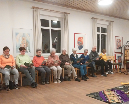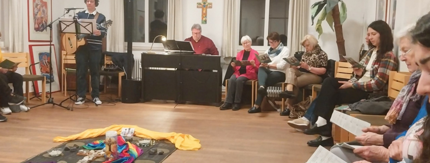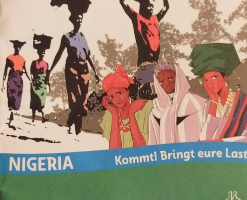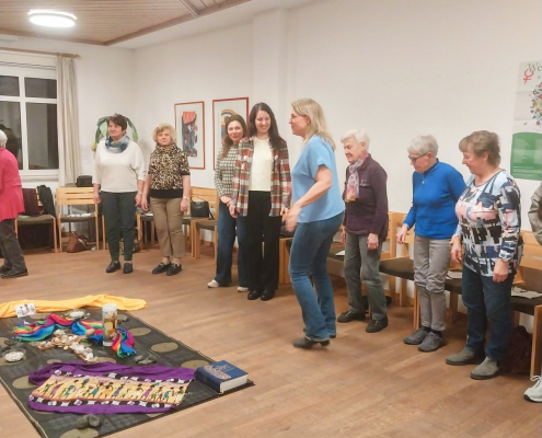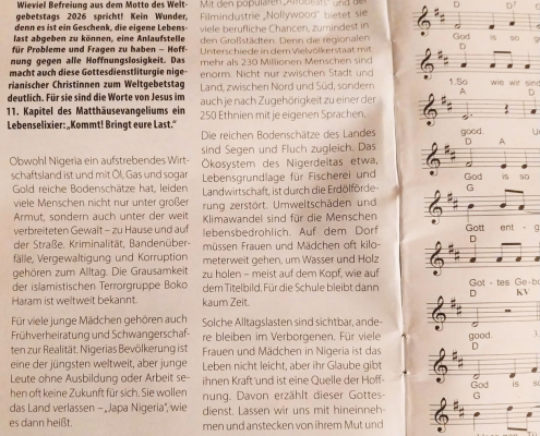 Das gemeinsame Gebet wurde begleitet von einfühlender Musik, nigerianischen Rhythmen und Köstlichkeiten nach nigerianischem Rezept. Das Thema „Hoffnung gegen alle Hoffnungslosigkeit – Kommt! Bringt eure Last“ wurde anhand nigerianischer Frauen und mittels einer Steinmeditation vertieft.