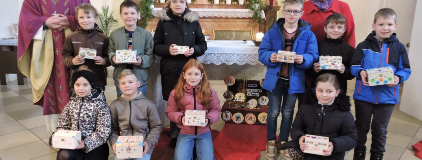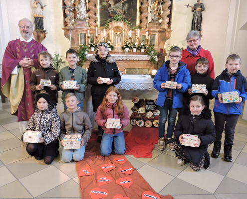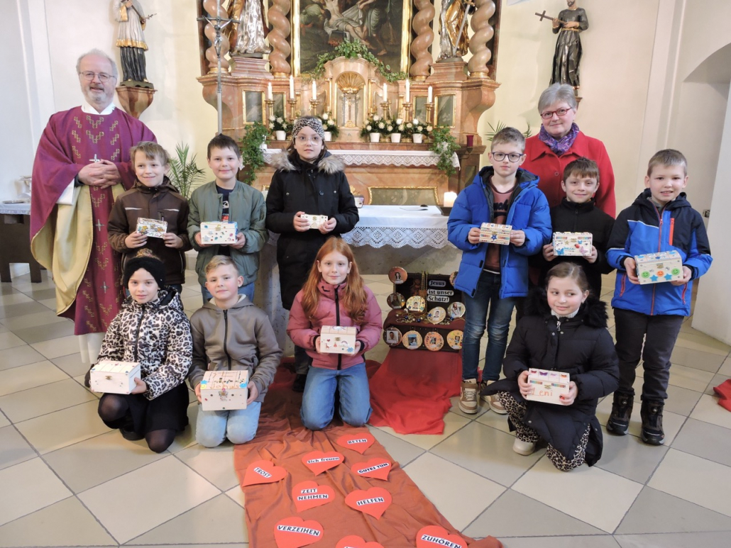 Vor einigen Wochen schon hat sich Michaela Probst mit den zehn Vilzinger Kommunionkindern aufgemacht, sich in Gruppenstunden auf das Sakrament der Kommunion vorzubereiten. Beim Sonntagsgottesdienst am zweiten Advent stellten sich die Kinder nun den Kirchgängern aus der Expositur vor. Michaela Probst hat die Kommunionvorbereitung unter das Motto „Jesus ist unser Schatz“ gestellt, passend dazu füllt jedes Kind eine kleine Kiste mit eigenen, ideellen Schätzen, die dem jeweiligen Kind etwas bedeuten und „kleinen Zeichen, die uns an Jesus erinnern“, erklärte Michaela Probst die Idee hinter dem Motto.