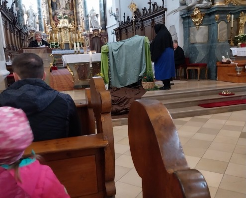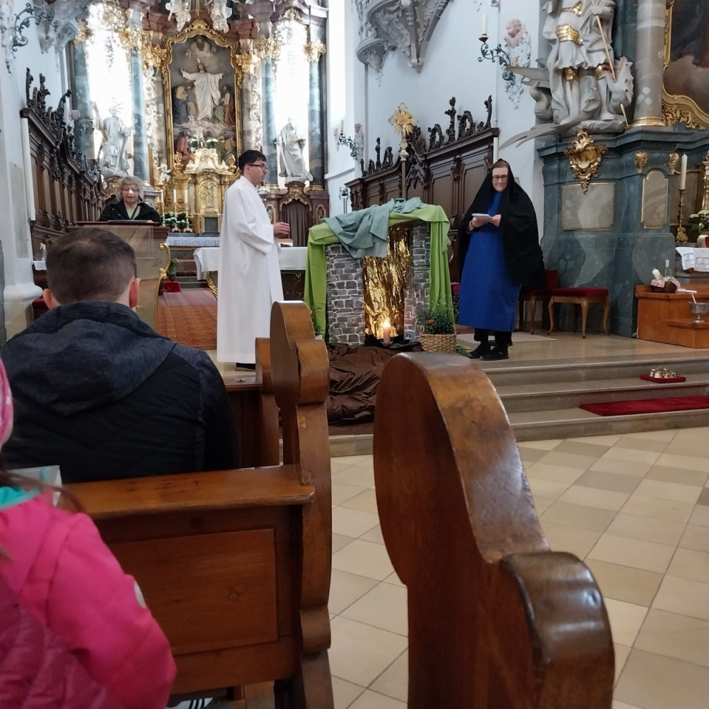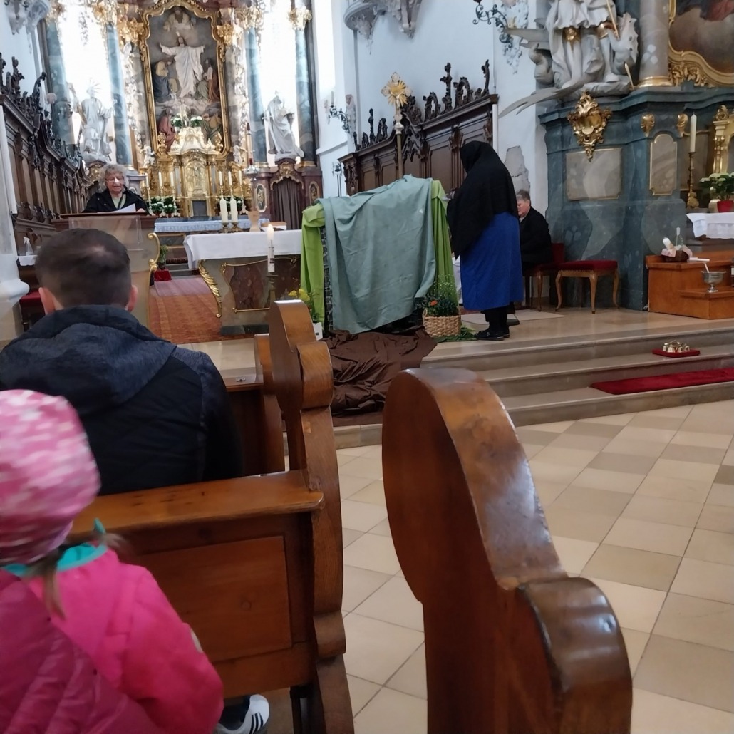 Begonnen wurde der Nachmittag vor dem großen Hauptportal der Kirche, auf dem Kirchplatz. Dort hatte schon unsere Mesnerin das Osterfeuer entzündet. Nach der Einführung und Segnung des Osterfeuers wurde die Osterkerze feierlich entzündet. Nach dem Einzug in die Kirche und einem kurzen Spiel über die Auferstehungsgeschichte, wurden die Kerzen der Besucher mit dem Osterfeuer entzündet.