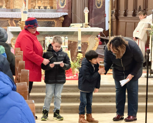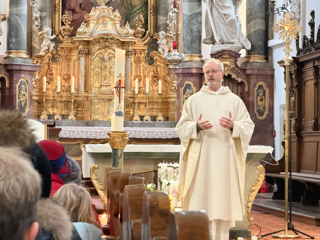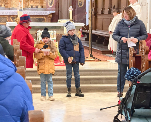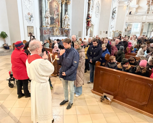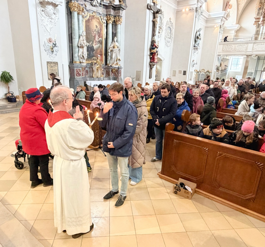 Zum Abschluss des Gottesdienstes konnten sich alle Besucherinnen und Besucher des Gottesdienstes den Blasiussegen mit dem Segenstext „Auf die Fürsprache des heiligen Blasius bewahre dich der Herr vor Halskrankheit und allem Bösen. Es segne dich Gott, der Vater und der Sohn und der Heilige Geist.“ spenden lassen.