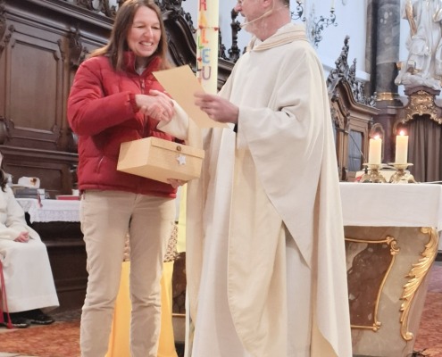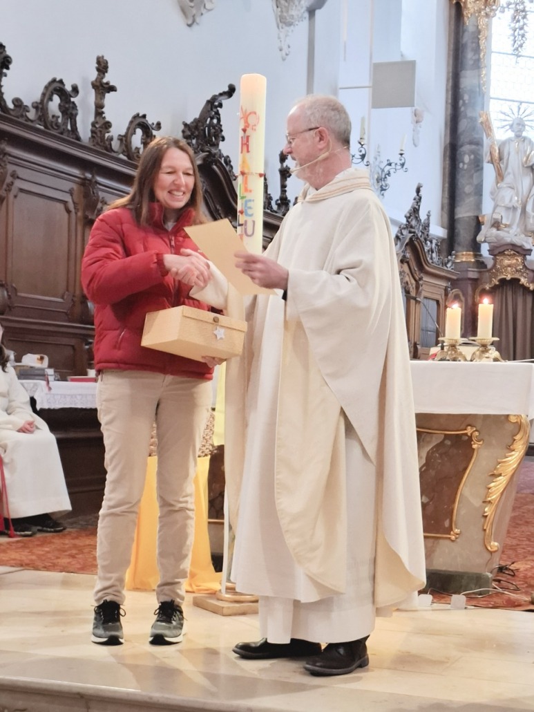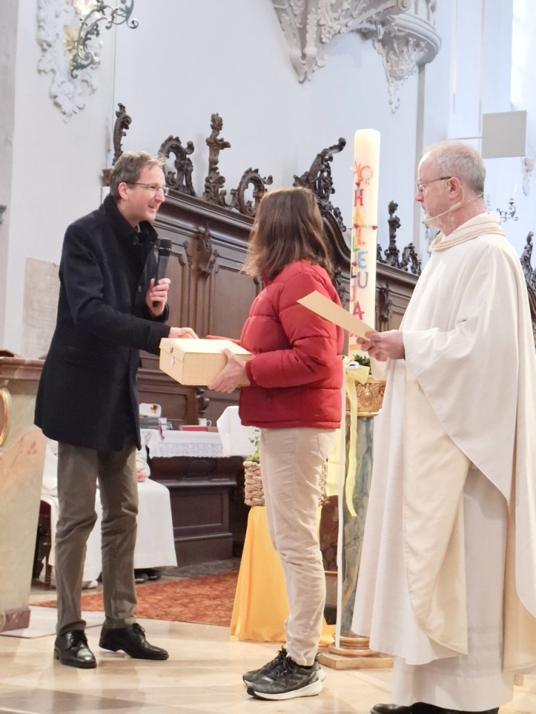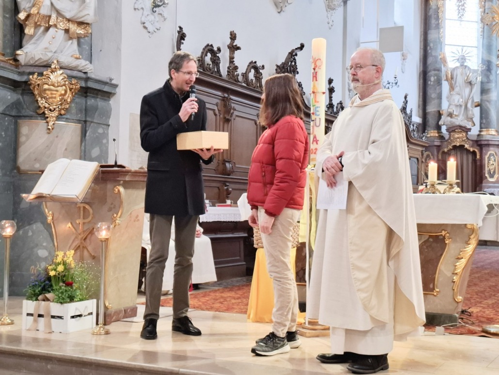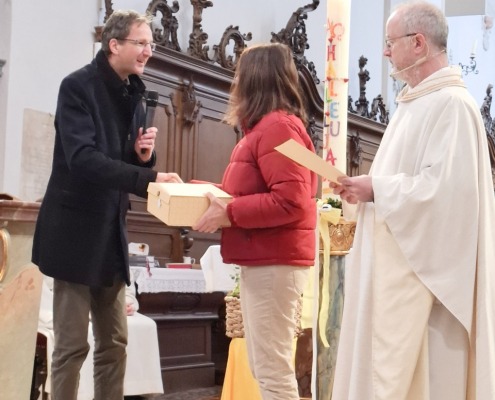 Es war uns eine Verpflichtung, Anliegen und Ehre zugleich, zum Beginn der neuen Amtsperiode auch den ausscheidenden Pfarrgemeinderatsmitgliedern Isabella Hartl für 8 Jahre und Anita Vogl für 20 Jahre Mitarbeit im PGR zu danken. Mit einem großen Vergelts Gott und einer Urkunde bedankte sich Pater Bartsch für die langjährige Bereitschaft zur Mitwirkung im Gremium. Pfarrgemeinderatssprecher Dr. Martin Moro überreichte ein mit kulinarischen Genüssen sowie mit einer Plätzchenbackform in Form einer Jakobsmuschel gefülltes Präsent und bedankte sich für die geleistete Arbeit, die vielen Ideen und gemeinsamen Umsetzungen. Mit einem großen Applaus stimmten die Besucherinnen und Besucher ein. Vielen lieben Dank und ein herzliches Vergelts Gott!