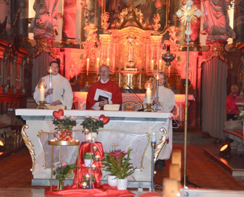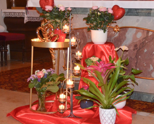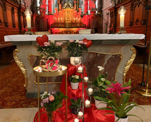 In vielen Pfarreien finden am Valentinstag besondere Gottesdienste statt. Da dieses Jahr der Valentinstag wunderbar passend auf einen Samstag fiel, lag es sehr nahe, die Vorabendmesse hier besonders im Zeichen der Liebe zu gestalten. So durften wir bei uns in Cham St. Jakob unter dem Motto „Let’s celebrate love!“ besonders Paare, Verliebte, aber auch alle weiteren Besucherinnen und Besucher in der Pfarrkirche begrüßen.