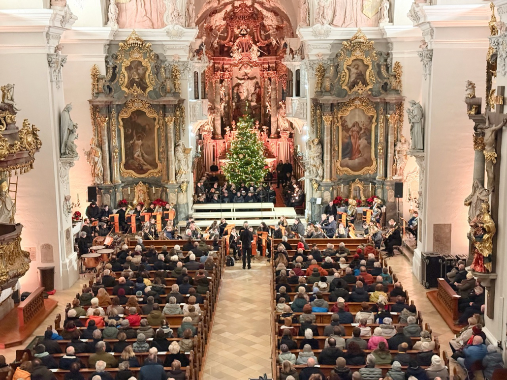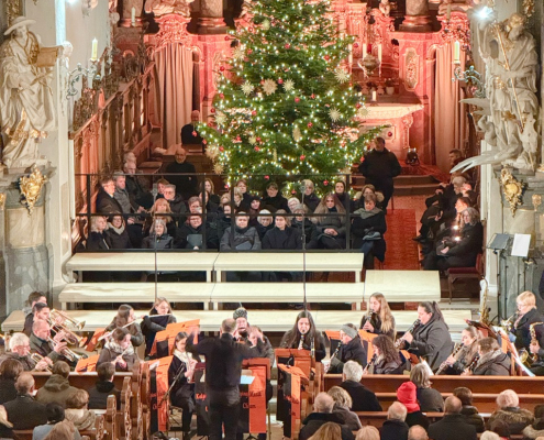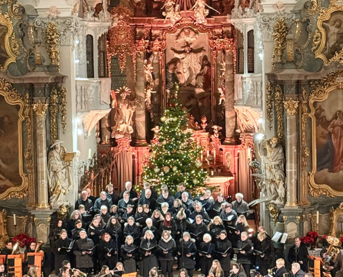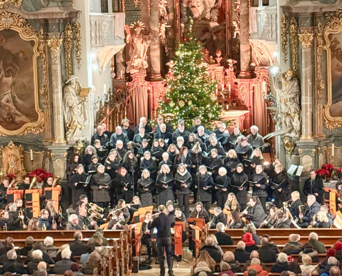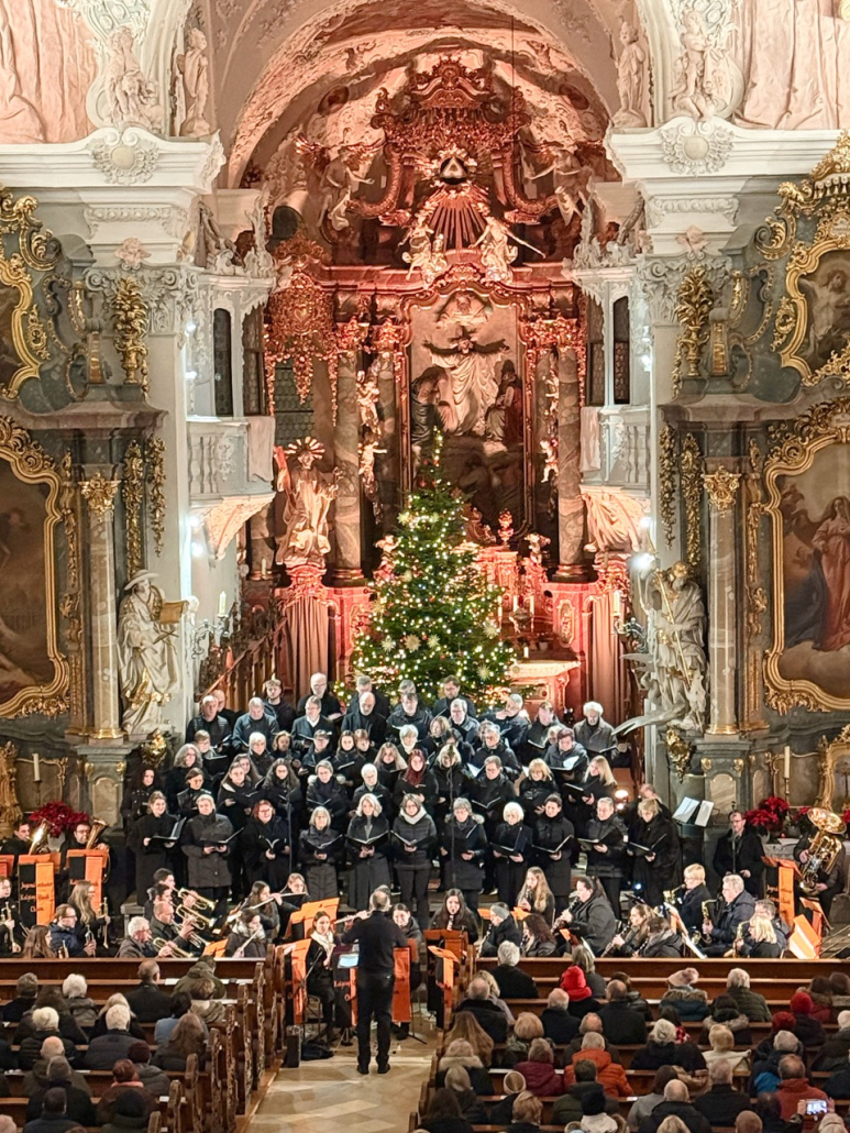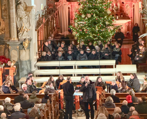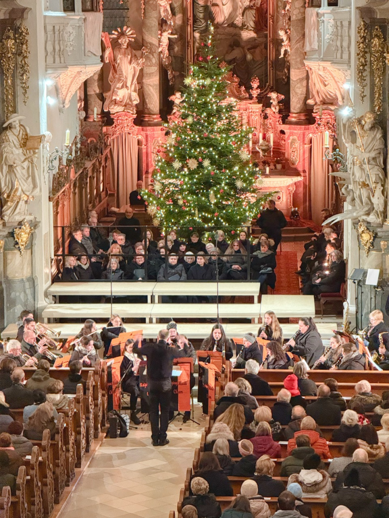 Nach einer Begrüßung durch Pfarrer Pater Jens Bartsch machte die Stadtkapelle mit verschiedenen Stücken den Auftakt. Diese ließen bereits eindrucksvoll den Klangkörper erleben und die Erwartungen steigen. Es folgte sodann das Hauptwerk des Abends, die „Große Weihnachtspartita, vorgetragen in 11 Teilen im Wechsel der Stadtkapelle, begleitet vom großen Chor und jeweils unterbrochen durch die von Andreas Förster vorgetragene Weihnachtsgeschichte. Der lang anhaltende Applaus am Ende des Konzerts gab der Begeisterung der Zuhörerinnen und Zuhörer Ausdruck. Liebe Instrumentalistinnen und Instrumentalisten, liebe Sängerinnen, liebe Sänger und lieber Sprecher, ihr habt eindrucksvoll euer Können gezeigt! Unser großer Applaus dafür! Lieber Dirigent und liebe Chorleiterinnen und Chorleiter, vielen Dank für eure Mühe des Einstudierens und Übens. Es hat sich wundervoll angehört!