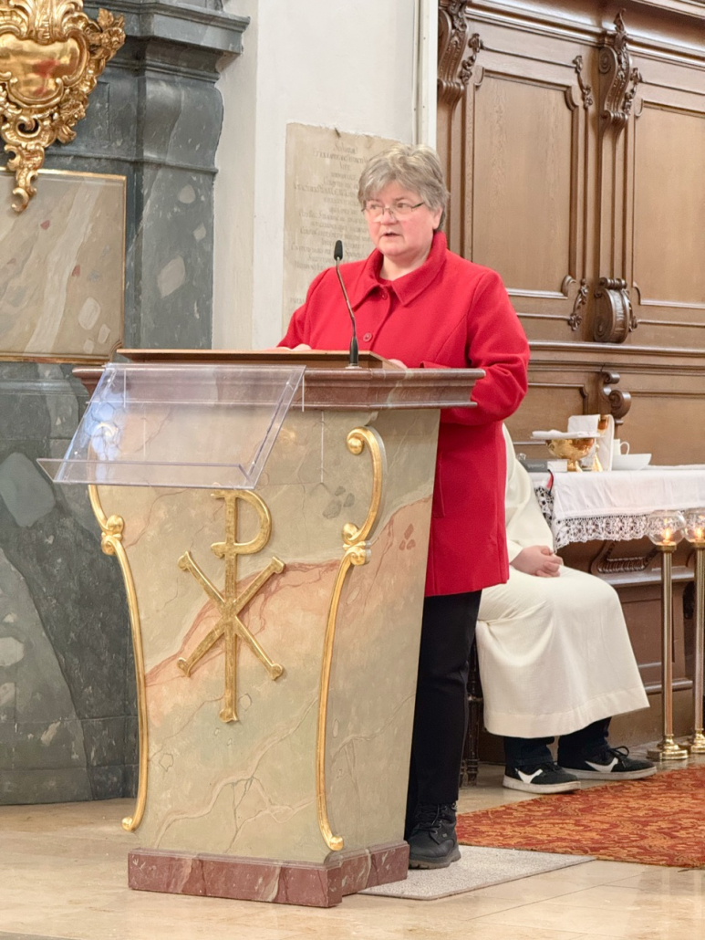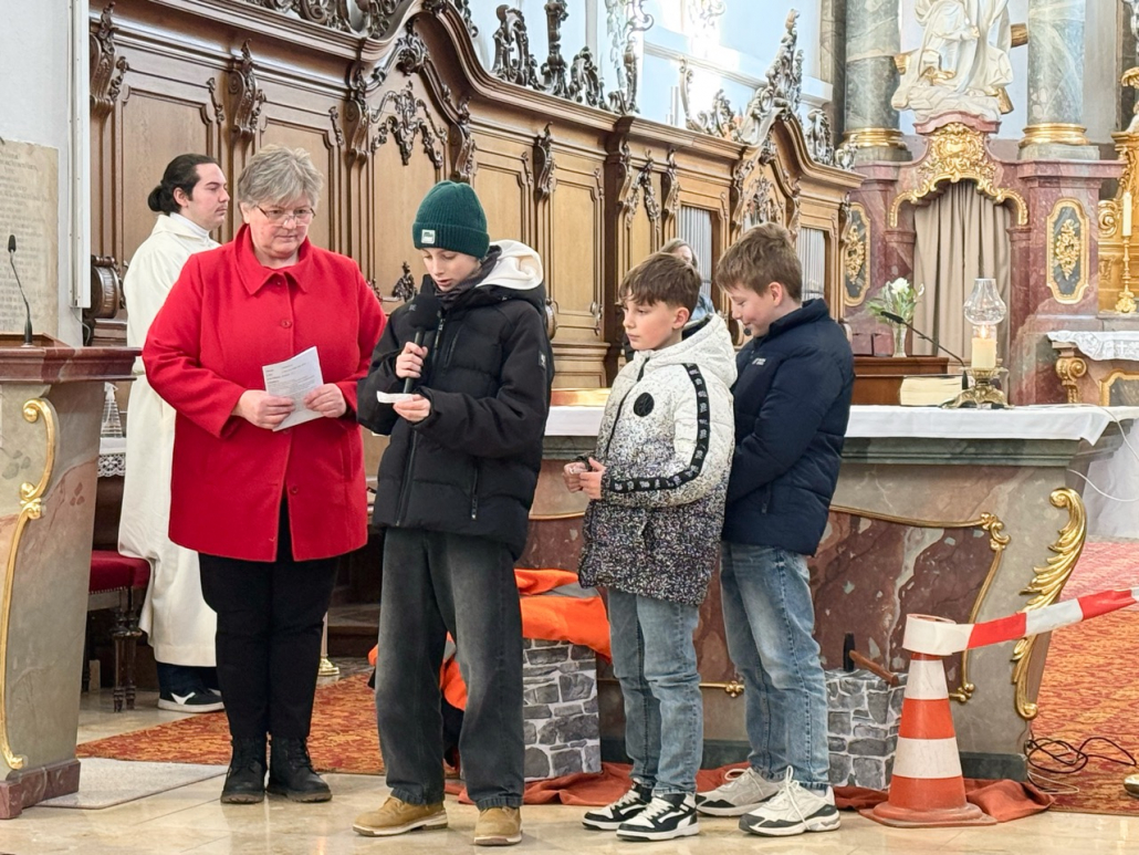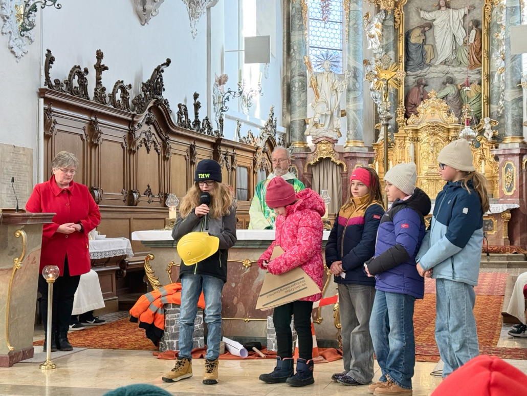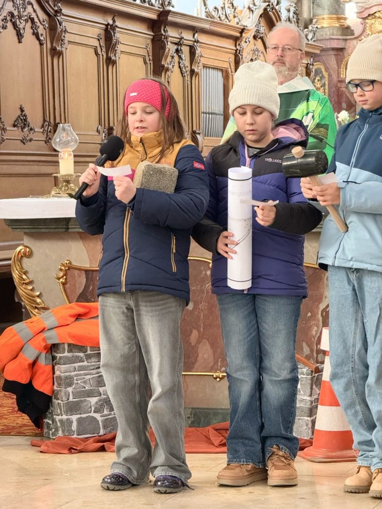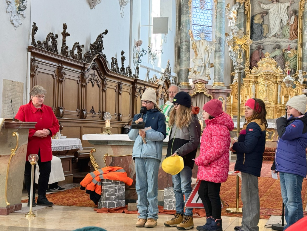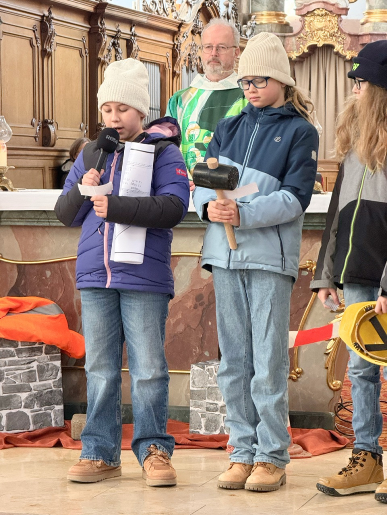 Heute waren nahezu alle Firmlinge in den ersten Bänken der Kirche anwesend und gestalteten den Gottesdienst auf verschiedene Art und Weise mit. In den Eingangsworten erklärte Gemeindereferentin Michaela Probst, dass auch die Kirche eine dauerhafte Baustelle ist, vieles neu aufgebaut wird und aufgebaut werden muss. Aber auch an vielen Stellen die lebendigen Steine bröckeln. Hier ist es wichtig, so Pfarrer Pater Jens Bartsch in seiner Predigt, dass es immer wieder Menschen gibt, die Zeuge sein wollen für den Glauben und Zeugnis ablegen für Jesus Christus. Solche Zeugen sollen auch die Kinder sein, die dieses Jahr das Sakrament der Firmung empfangen werden. Als Zeichen dafür erhielt jedes Firmkind aus den Händen des Pfarrers und der Gemeindereferentin ein persönliches Exemplar des Glaubensbekenntnisses.