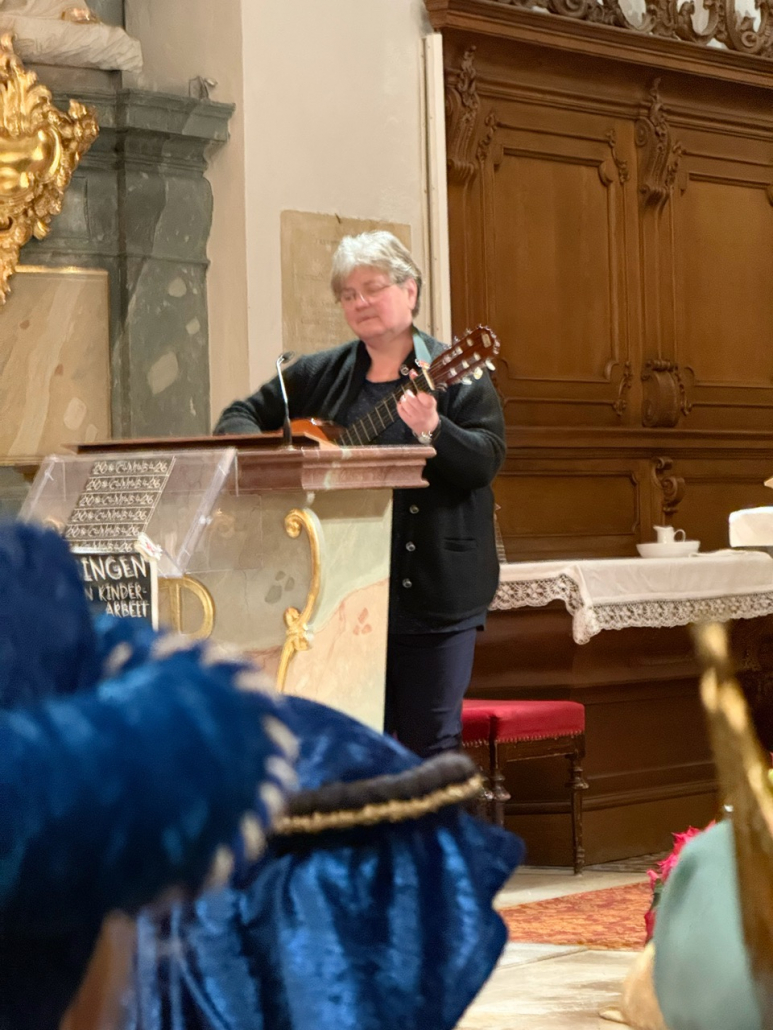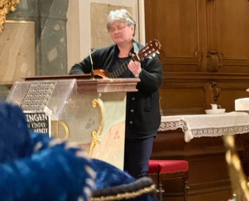 Damit sich alle Besucherinnen und Besucher des Familiengottesdienstes das Leben der Heiligen Lucia gut vorstellen konnten, war durch den Pfarrgemeinderat eine große Beamer-Leinwand aufgebaut worden. Auf dieser konnte die Lebensgeschichte passend zum vorgetragenen Text mit Bildern nachvollzogen werden. Gemeindereferentin Michaela Probst und Dominik Götz haben sich viel Mühe gegeben, die Kinder mit in die Feier einzubeziehen. Durch das Vortragen von Texten zu den auf dem Altar abgestellten Kerzen sowie durch gemeinsam gesungene Lieder, begleitet von Michaela Probst auf der Gitarre, ergab sich ein lebhafter und abwechslungsreicher Gottesdienst. „Freut euch“ war durchaus zu spüren.