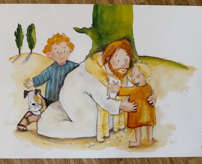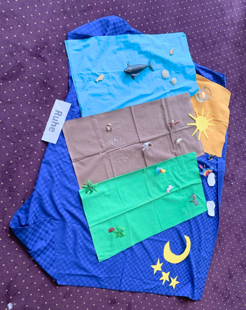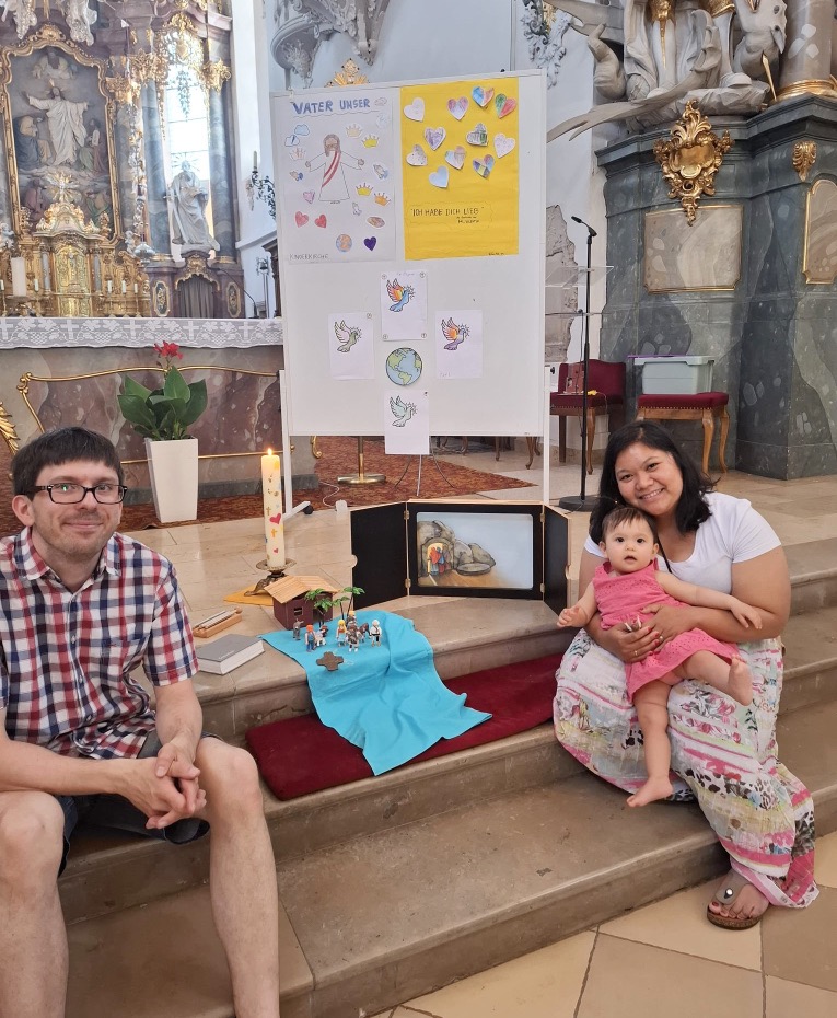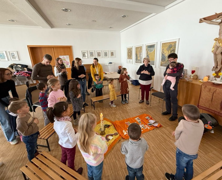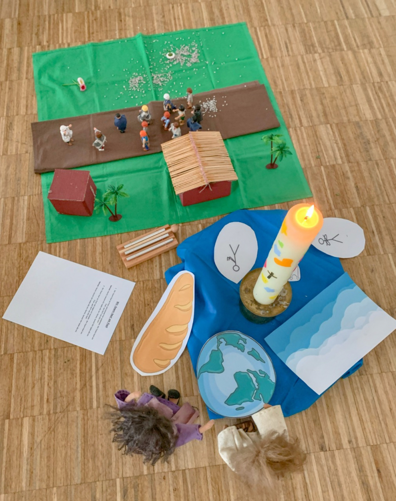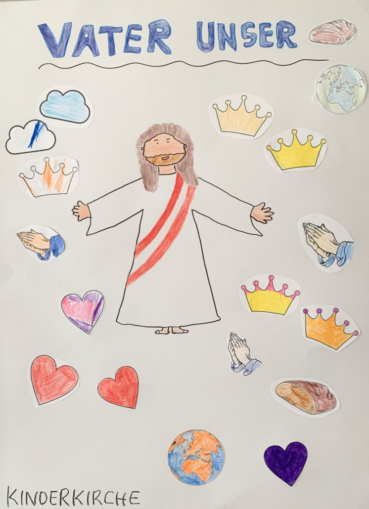 Diese wird dann mittels eines Bodenbildes mit Tüchern, Figuren und Legematerialien in der Kreismitte mit den Kindern gestaltet. Den Abschluss der Kinderkirche bildet der Einzug in die Pfarrkirche St. Jakob zum gemeinsamen Vater unser. Wir versammeln uns mit den Kindern und Eltern rund um den Alter und beten mit- und füreinander im großen Kreis Hand in Hand das Vater unser.