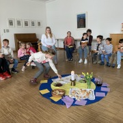 In dieser Kinderkirche erfuhren die Kinder, die Geschichte vom Gründonnerstag. Dabei wurde die Fußwaschung und das Letzte Abendmahl thematisiert. Es wurden sogar einem Jungen seine Füße gewaschen. Abgerundet wurde die Kirche mit einem gemeinsamen Mahl mit Fladenbrot und Traubensaft.