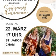 Das Passionssingen wird gestaltet von der Saitenmusik Waldmünchen zusammen mit Dr. Martin Moro als Sprecher der Passionstexte unter der Leitung von Sepp Meindl.