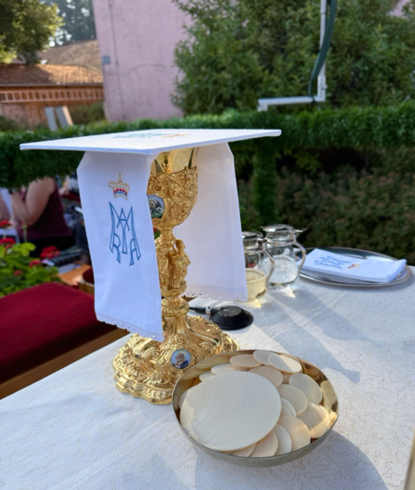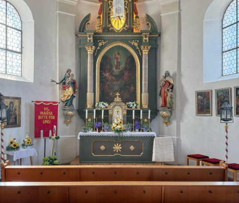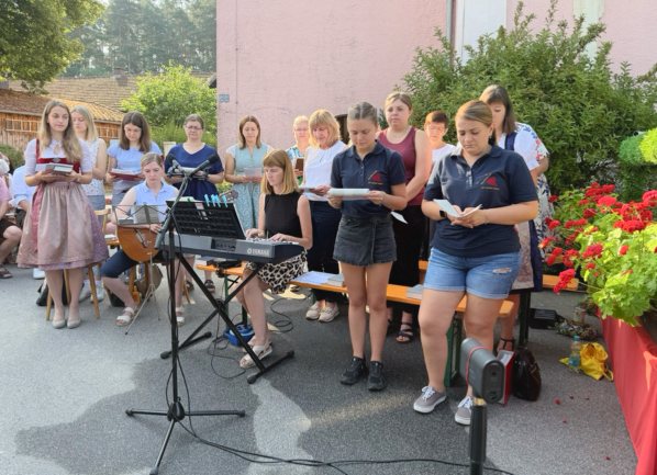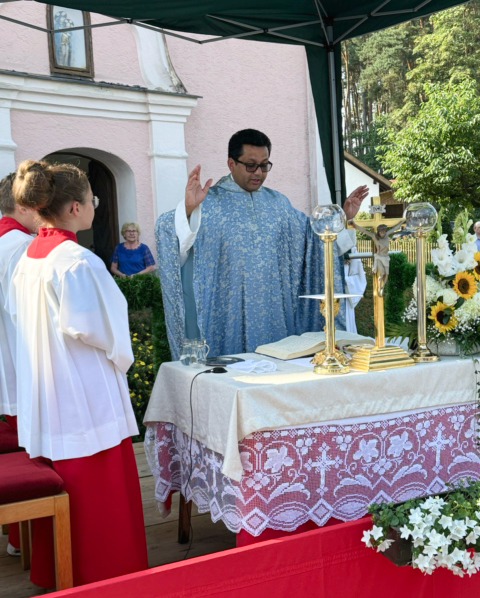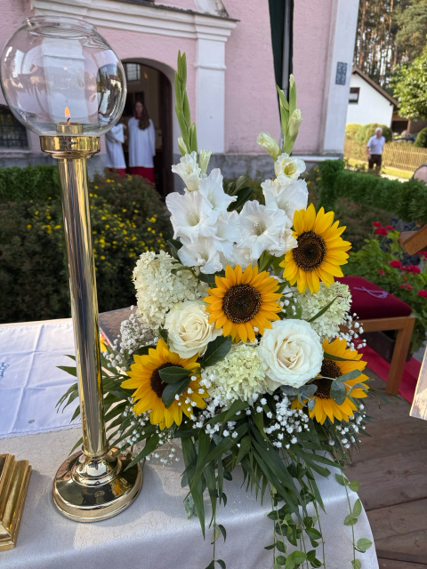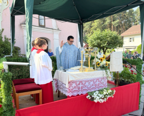 Im Halbrund vor der Wallfahrtskirche Mariä Himmelfahrt in Schönferchen war bereits alles für diesen Festtag vorbereitet. Der mit Girlanden und Blumen schön geschmückte Altar lud zur Mitfeier des Gottesdienstes ein. Vorsorglich aufgestellte Schirme und Pavillons spendeten zumindest teilweise wohltuenden Schatten.